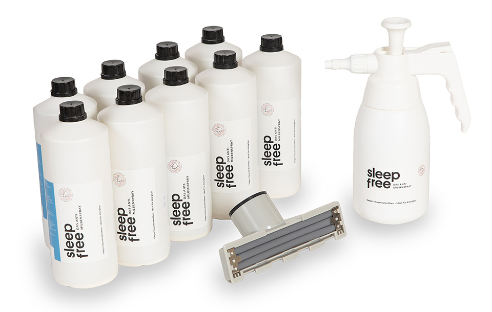 - mit dem Sleepfree Antimilbenspray die Matratzen einsprühen. 1 ltr. reicht für ca. 8 Matratzen.